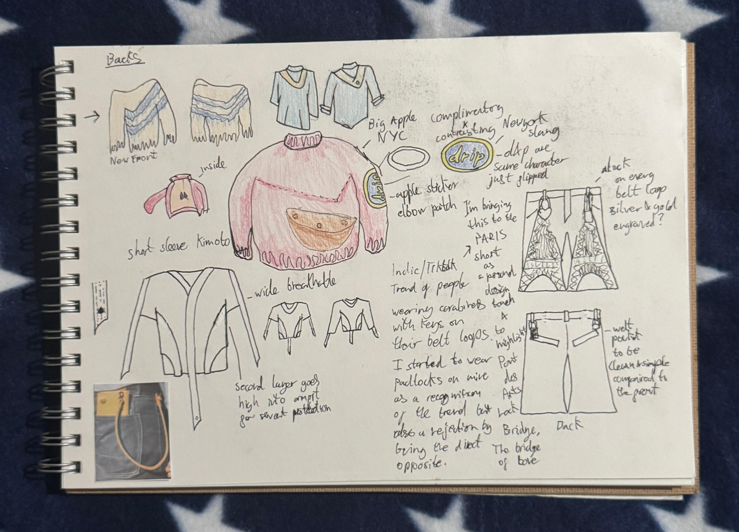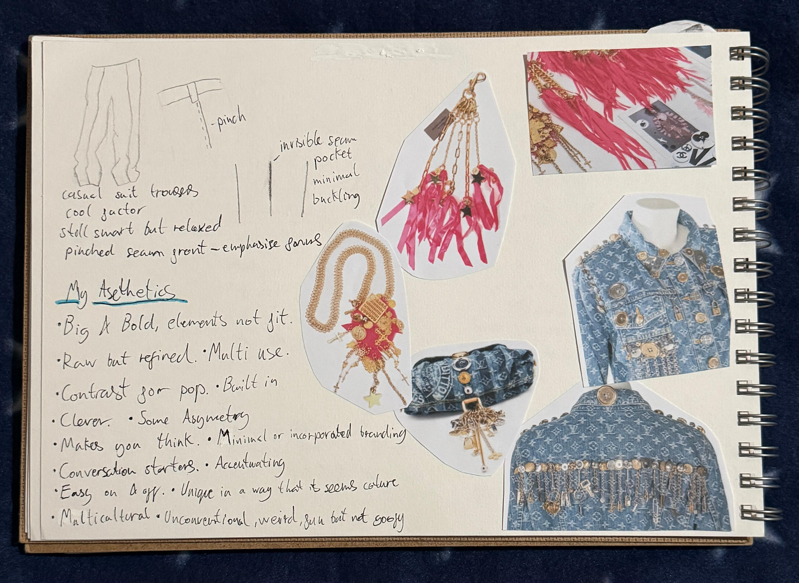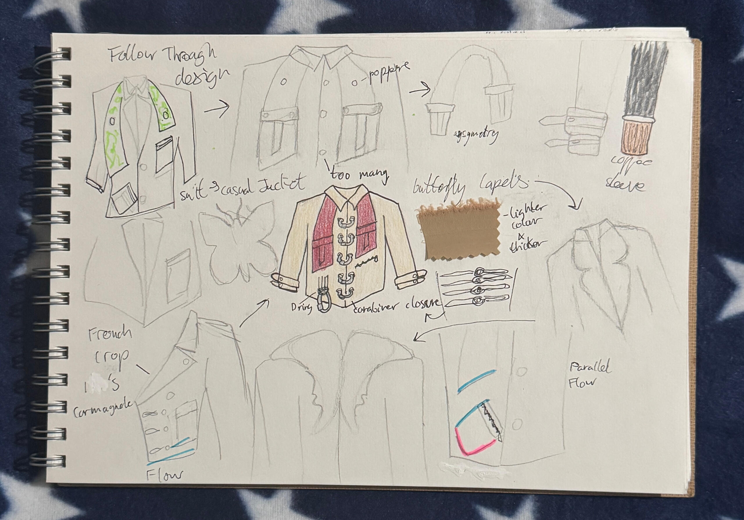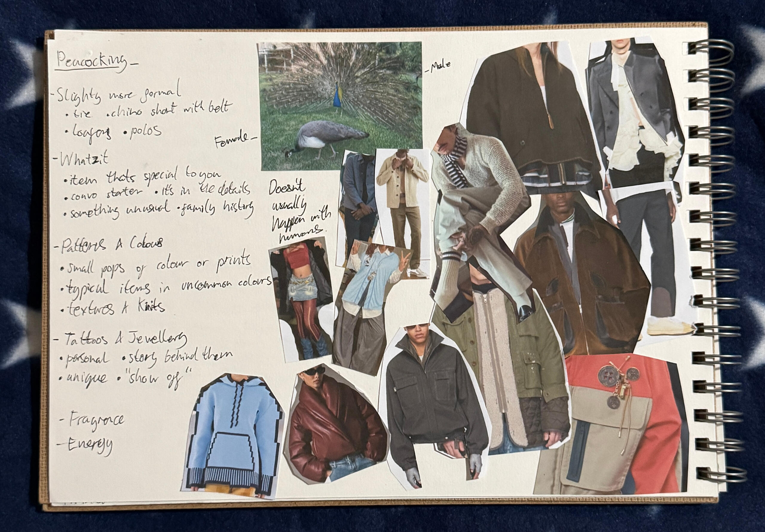 My voice in menswear: Cuts from Elsewhere.Purely a design project focusing on the process of research > design > development > final looks, aimed at exploring my voice in Menswear design and what exactly it is I'd like to add to the space.To explore this, I began with a questionnaire among my peers. Though the responses were inevitably biased, I did glean important information and found holes in my assumptions.Such as the overwhelming response that men love their leather jackets, it’s a classic and cool look for sure, but not one I’ve necessarily ever felt suited me. Why is that? What’s the leather jacket that I would want to wear, and what does it look like?Women’s fashion thrives on variety, playfulness and the boldness to express themselves in whichever way they see fit. Why does men’s clothing seem so restrictive? I want to reintroduce fun into menswear, breaking away from the standardised, uninspired options dominating people's wardrobes.Fit is most important when it comes to clothing, I aim to celebrate masculine silhouettes, emphasising broad shoulders and strong arms. But beyond structure, I am drawing inspiration from masculinity in nature. Male birds, like peacocks, are the flamboyant ones, using vibrant plumage to attract mates. Something that I find to be opposite in fashion amongst humans.Historically, men wore lavish gowns, heels, fur, and frills. Traces of this can still be found in other cultures, from traditional Asian and Arab garments to religious wear. Modern menswear has lost this and I want to reintroduce it.This is why I am pulling from what I know and see, my London is a multicultural landscape, and my designs reflect that. I’ve attempted to bring Japanese silhouettes, European traditions, African-American streetwear, French sensibility and more. I’ve woven in more feminine rounded shapes and cropped cuts, see-through and sheer materials, while maintaining functionality, and style for the modern man.I’m trying to redefine masculinity through contrast, strength meets softness, structure meets flow. And a little playfulness. Men deserve clothing that dares to be noticed without sacrificing wearability or confidence. Pieces that make people pause and grant intrigue.This project is a call to be expressive and free in men's fashion.