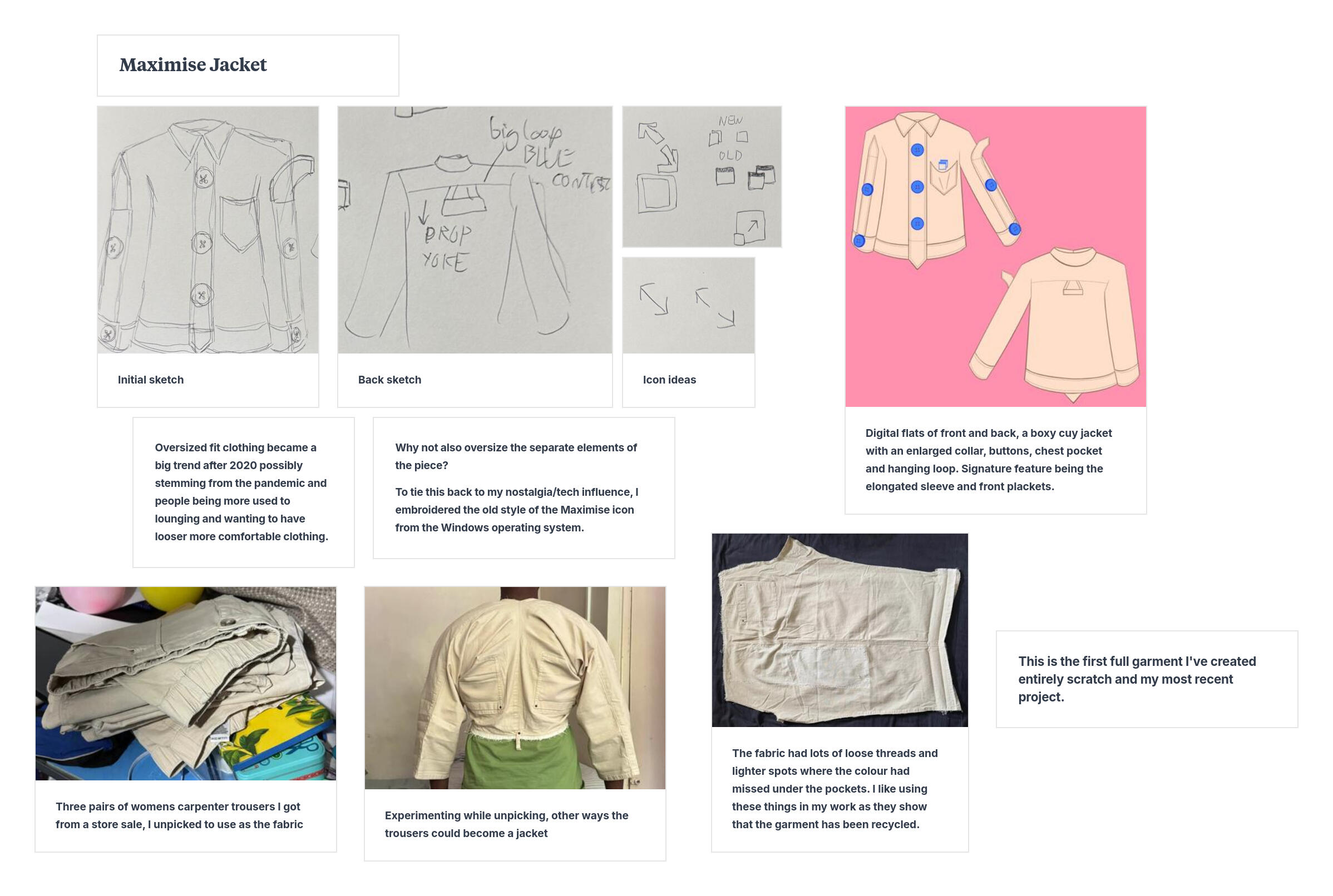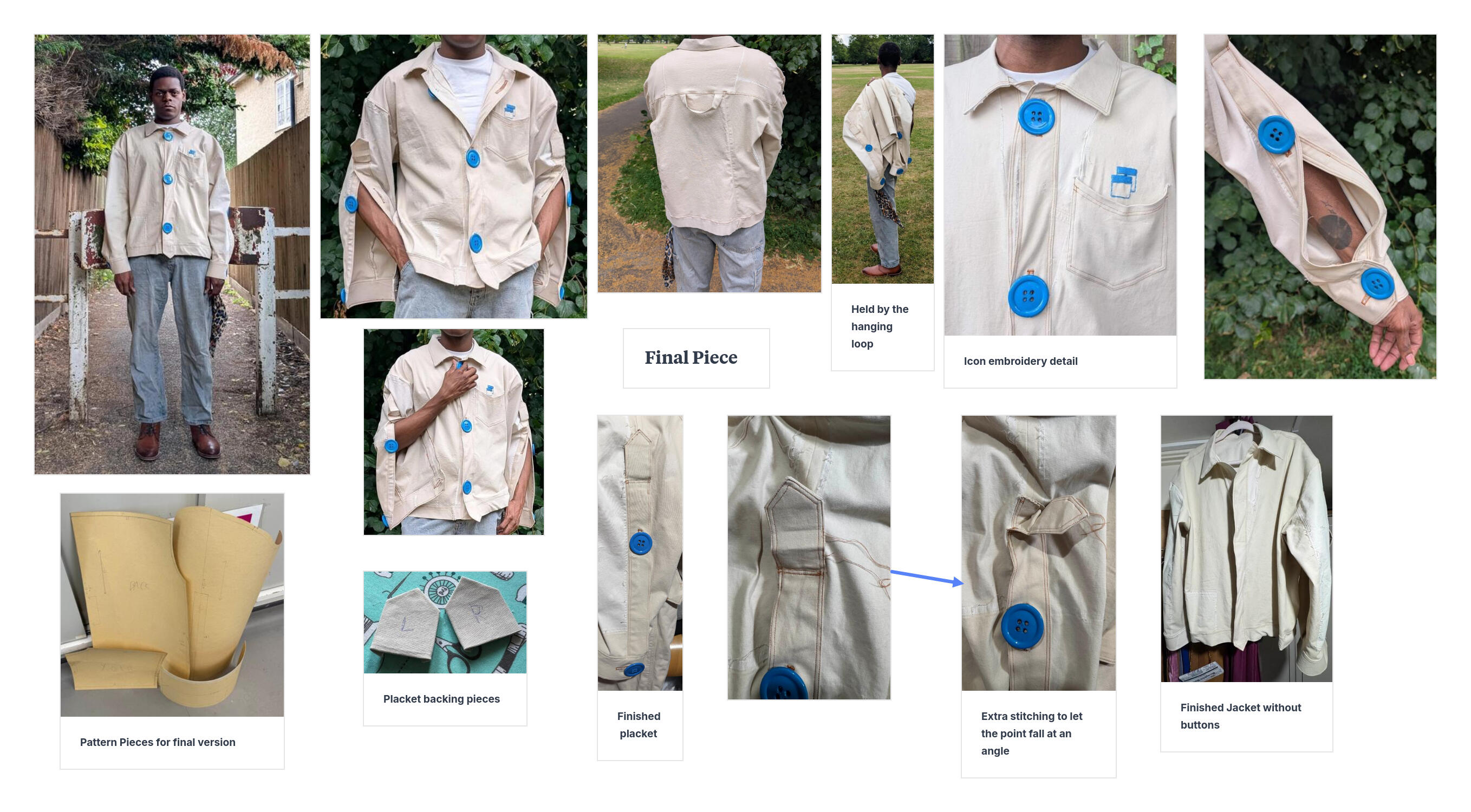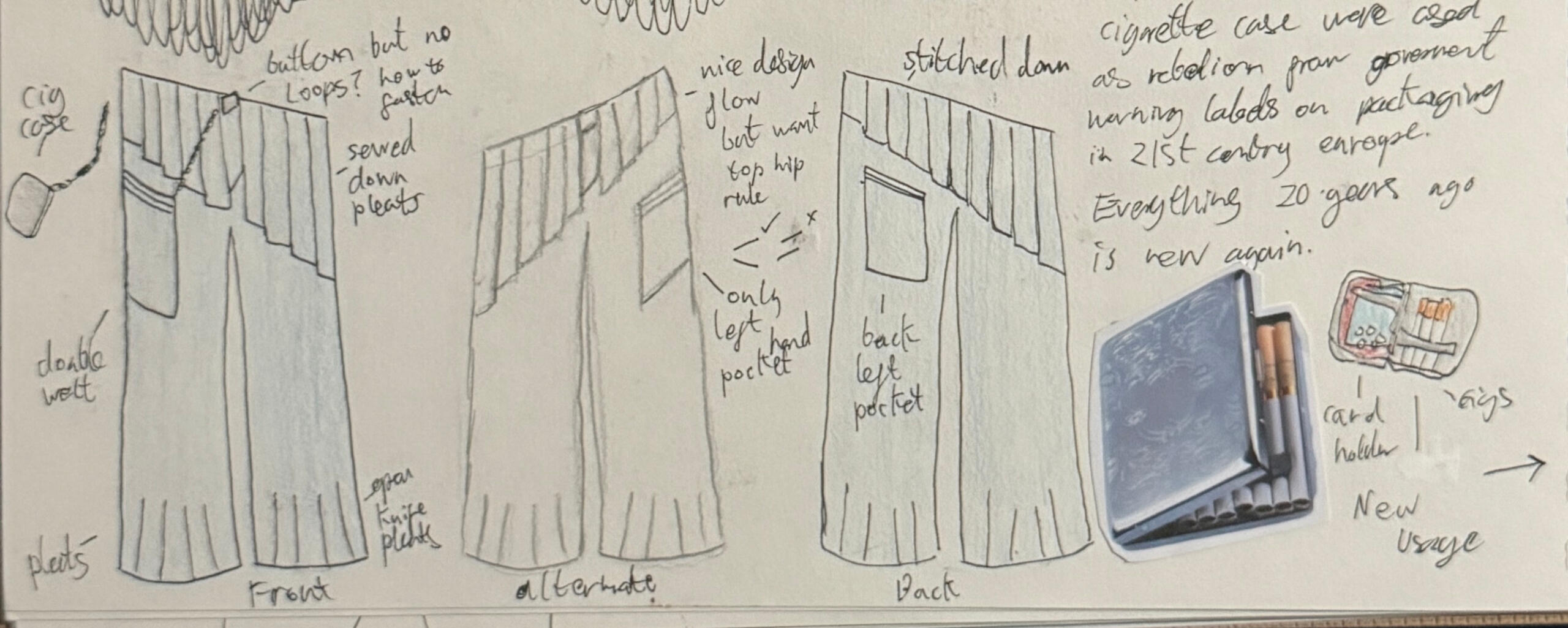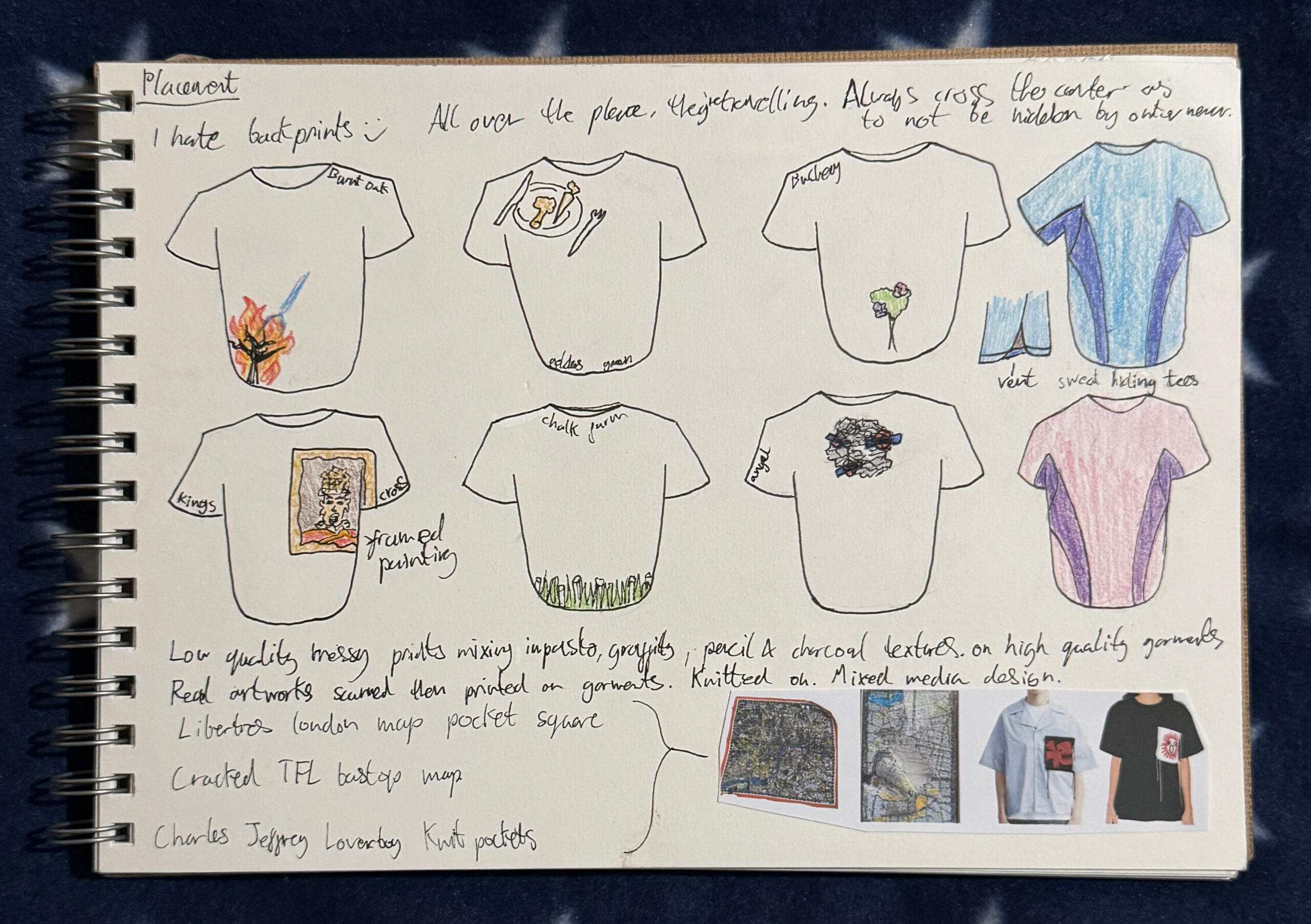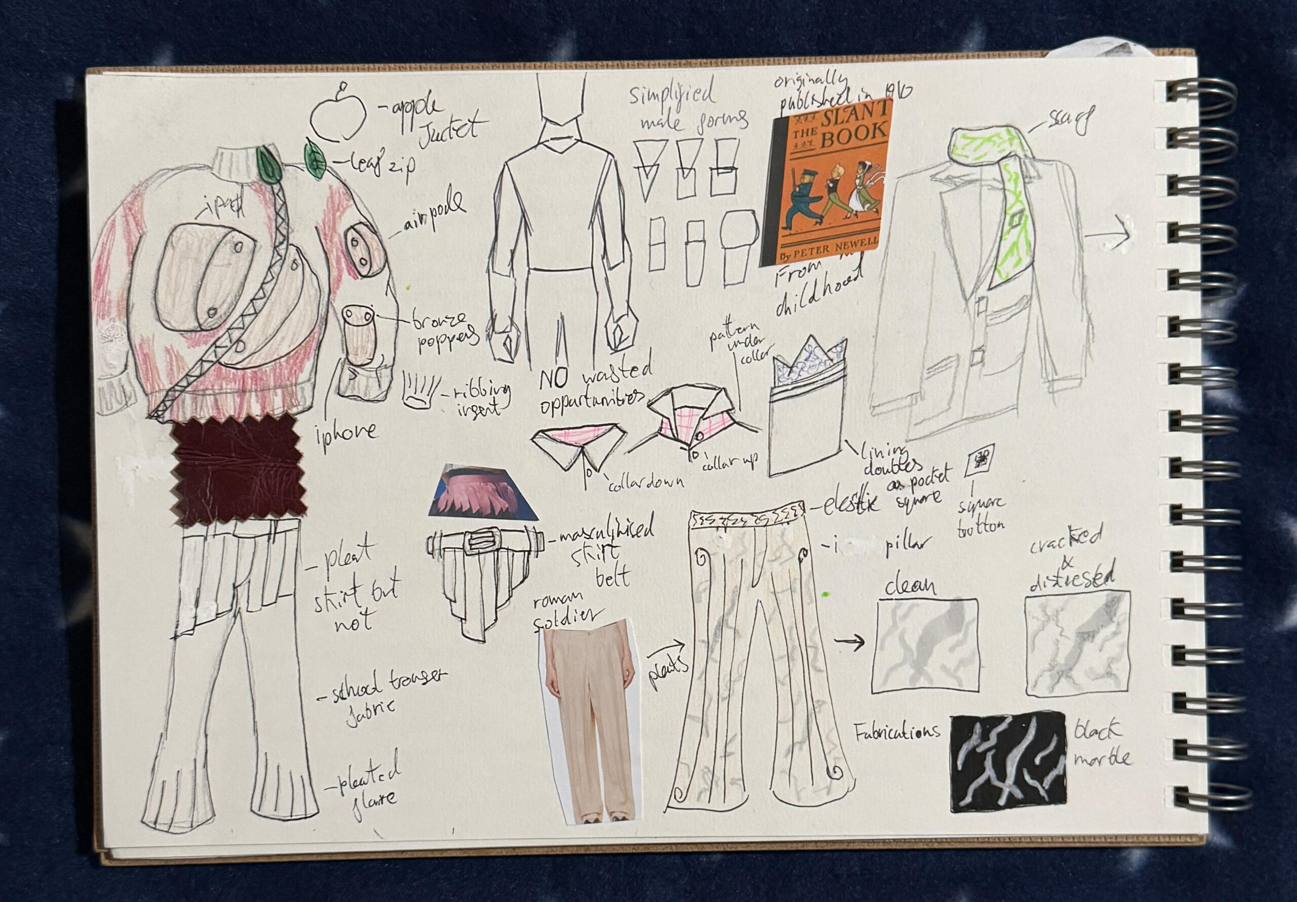 My voice in menswear: Cuts from Elsewhere.Purely a design project focusing on the process of research > design > development > final looks, aimed at exploring my voice in Menswear design and what exactly it is I'd like to add to the space.To explore this, I began with a questionnaire among my peers. Though the responses were inevitably biased, I did glean important information and found holes in my assumptions.Such as the overwhelming response that men love their leather jackets, it’s a classic and cool look for sure, but not one I’ve necessarily ever felt suited me. Why is that? What’s the leather jacket that I would want to wear, and what does it look like?Women’s fashion thrives on variety, playfulness and the boldness to express themselves in whichever way they see fit. Why does men’s clothing seem so restrictive? I want to reintroduce fun into menswear, breaking away from the standardised, uninspired options dominating people's wardrobes.Fit is most important when it comes to clothing, I aim to celebrate masculine silhouettes, emphasising broad shoulders and strong arms. But beyond structure, I am drawing inspiration from masculinity in nature. Male birds, like peacocks, are the flamboyant ones, using vibrant plumage to attract mates. Something that I find to be opposite in fashion amongst humans.Historically, men wore lavish gowns, heels, fur, and frills. Traces of this can still be found in other cultures, from traditional Asian and Arab garments to religious wear. Modern menswear has lost this and I want to reintroduce it.This is why I am pulling from what I know and see, my London is a multicultural landscape, and my designs reflect that. I’ve attempted to bring Japanese silhouettes, European traditions, African-American streetwear, French sensibility and more. I’ve woven in more feminine rounded shapes and cropped cuts, see-through and sheer materials, while maintaining functionality, and style for the modern man.I’m trying to redefine masculinity through contrast, strength meets softness, structure meets flow. And a little playfulness. Men deserve clothing that dares to be noticed without sacrificing wearability or confidence. Pieces that make people pause and grant intrigue.This project is a call to be expressive and free in men's fashion.