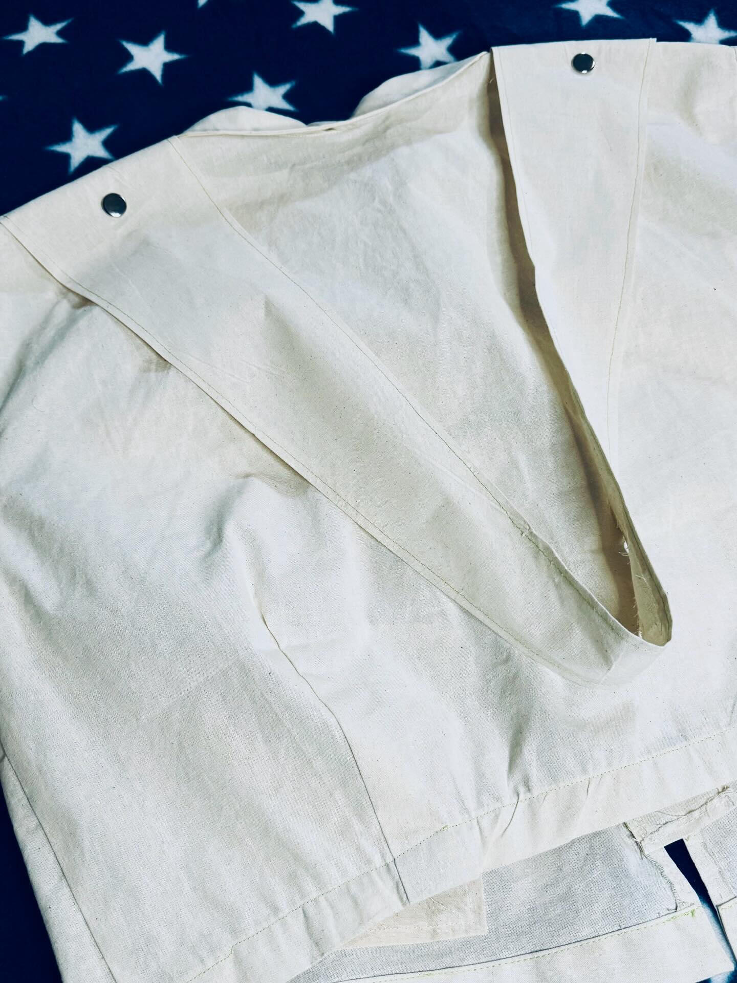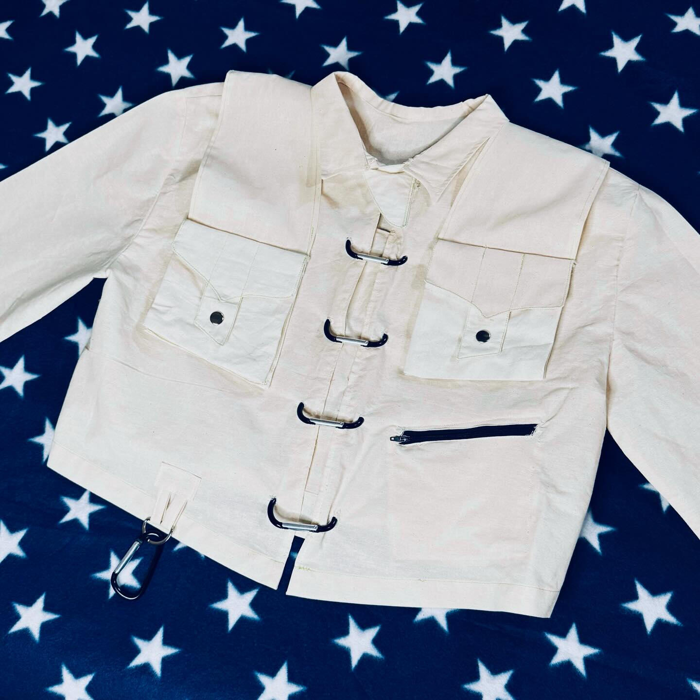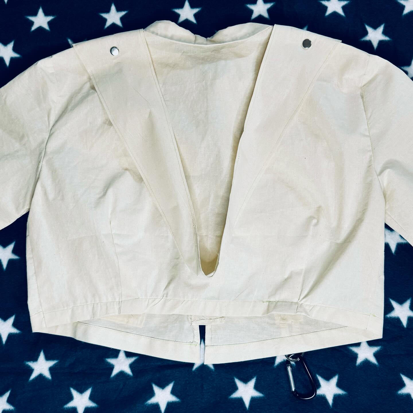 A cropped jacket with no lack of hardware or functionality. It features removable pockets that become a two-sided crossbody bag, a carabiner front closure with zip-guard, a D-ring hanging loop for wearer customisation and a third zip pocket. A modernisation of the French Revolution era Carmagnole jacket. Which gives it this cropped V-shaped hem, limited closure (usually only had 3-4 buttons), and large sleeve cuffs. The bag strap comes to the back and mimics the front V. It is only secured at the shoulder for movement and flare. The pockets became mirrored to follow the hem and increase the flow of the garment as a whole. The pockets/bag would be in a contrasting colour on the final version.