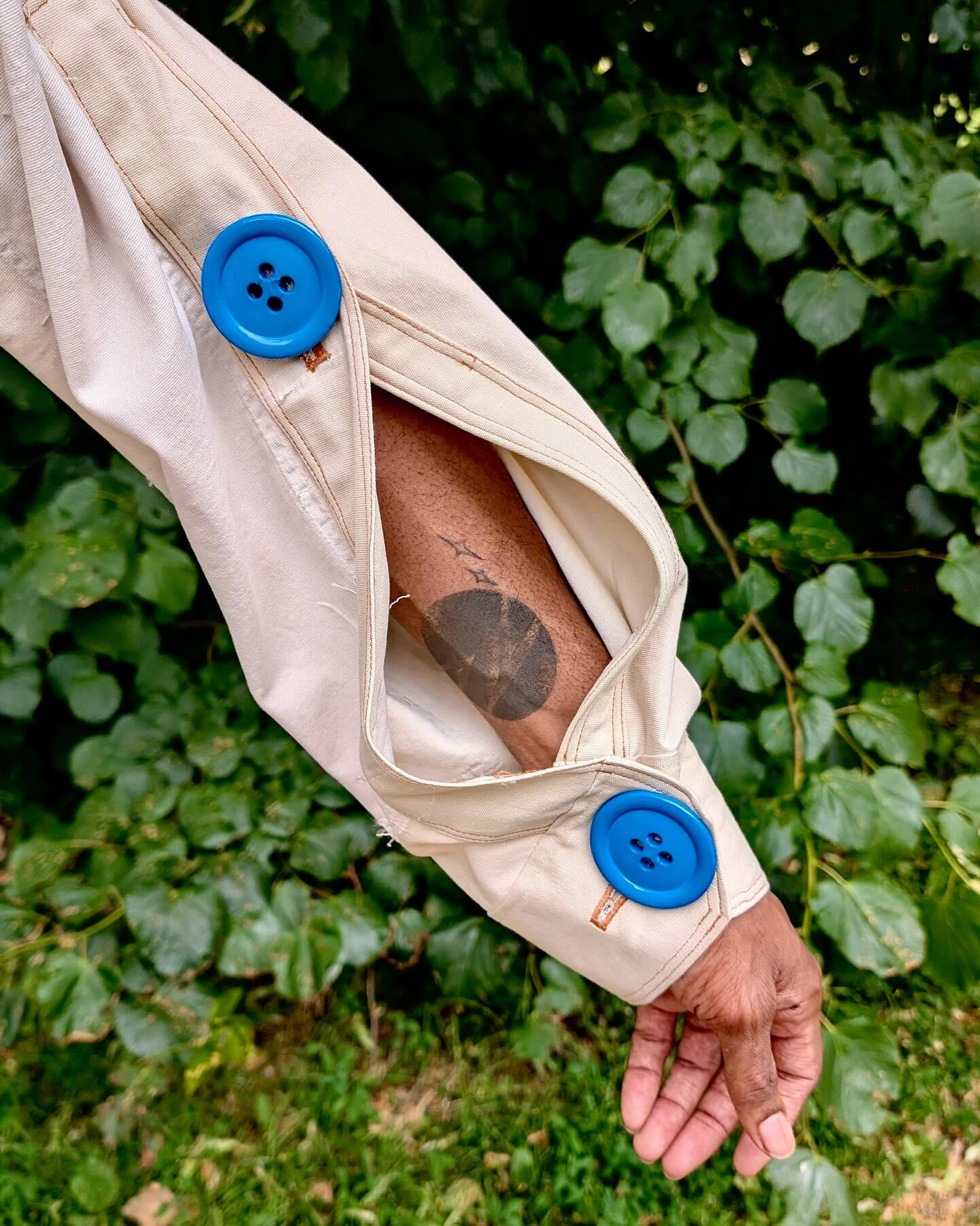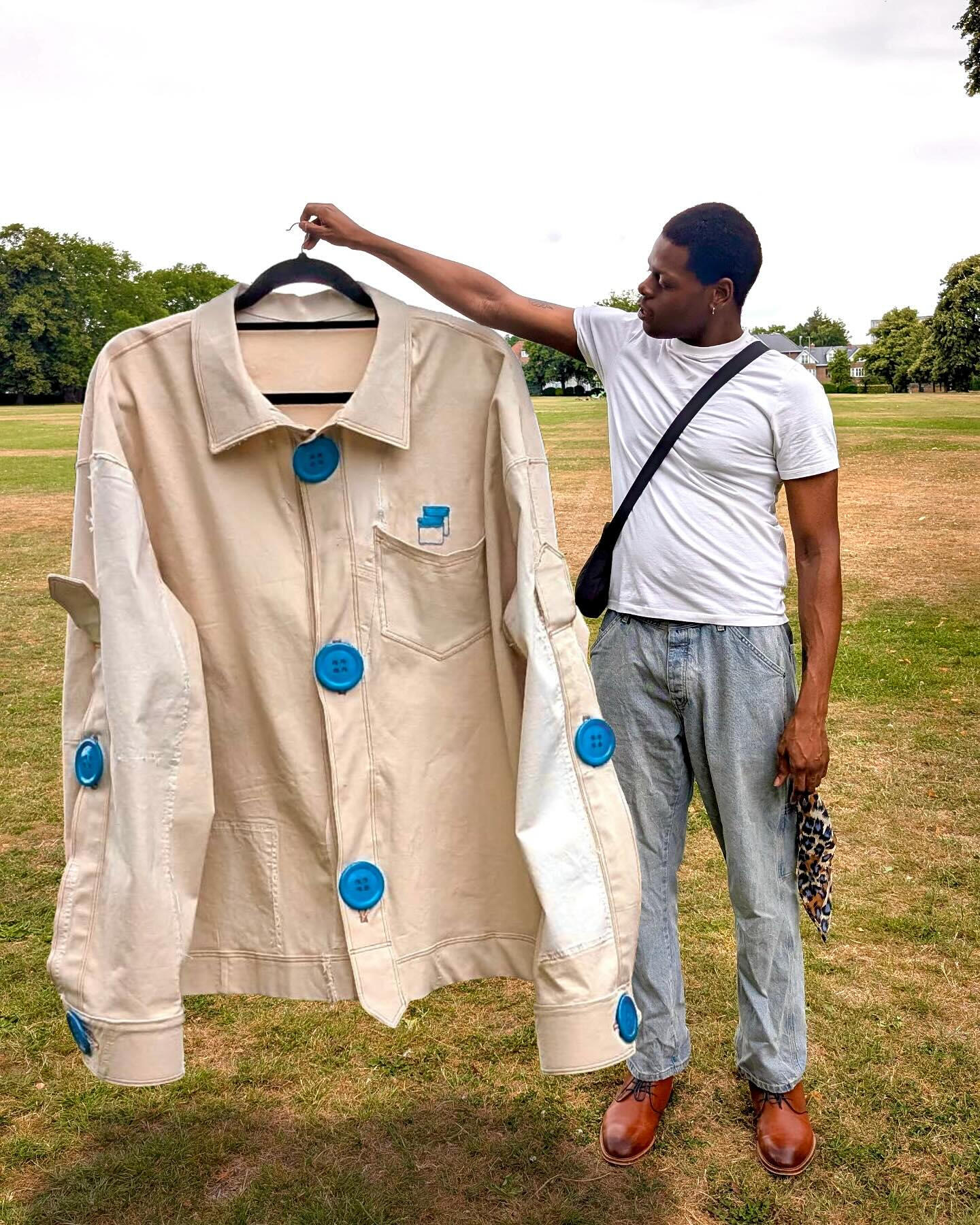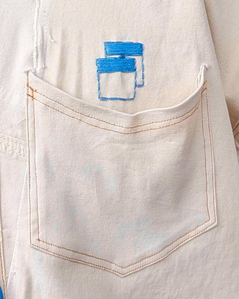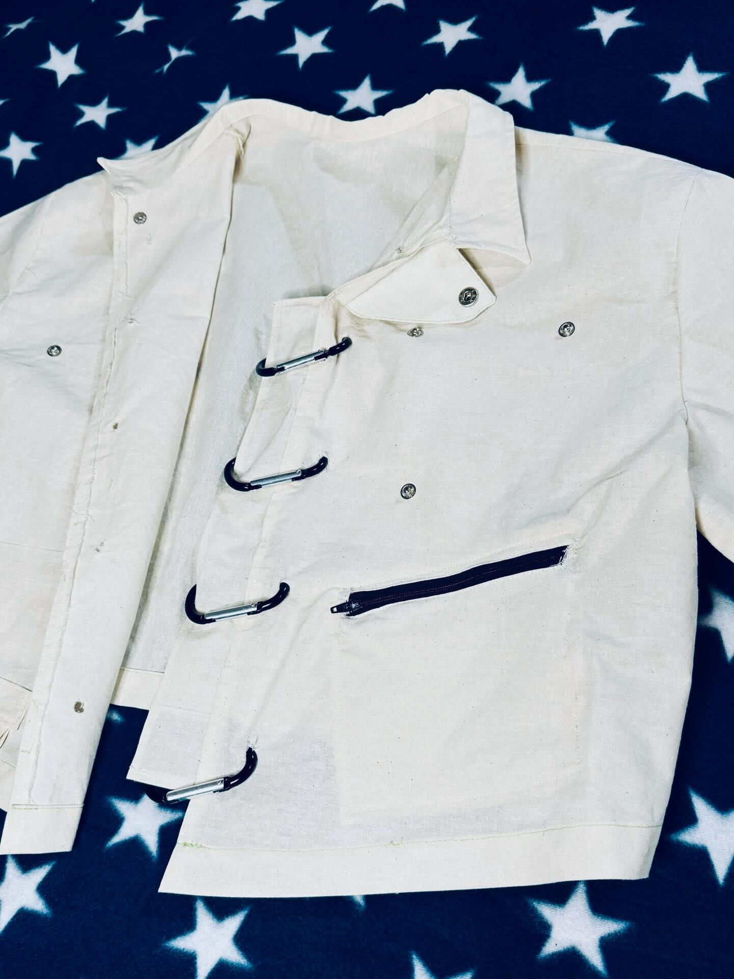 A pair of contrasting jackets, created as Halloween costumes but made to be more fashion-orientated and wearable outside of the Holiday.The Dayslinger Jacket: a modernised cowboy outfit, sandy fabric but with snap buttons.Loud hand-painted pocket graphics that conversate with each other. An embellished collar. Stitching detail on the front panels, a hand-stitched shoulder strap and holster feature which works as a third breast pocket and machine-stitched cowboy hat embroidery on the yoke. It says cowboy everywhere you look, fun, cool and eye-catching.