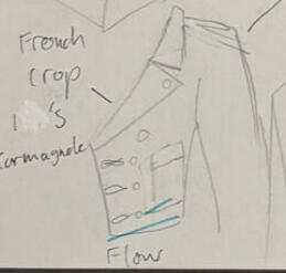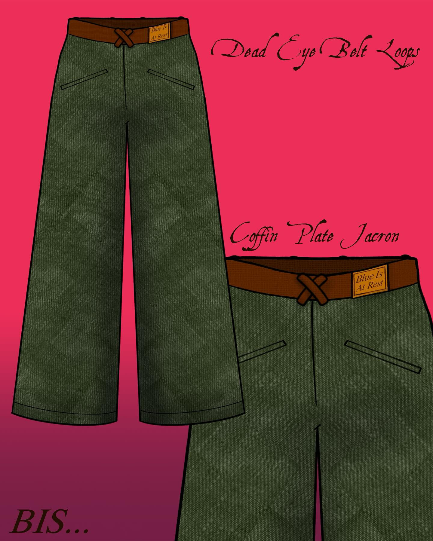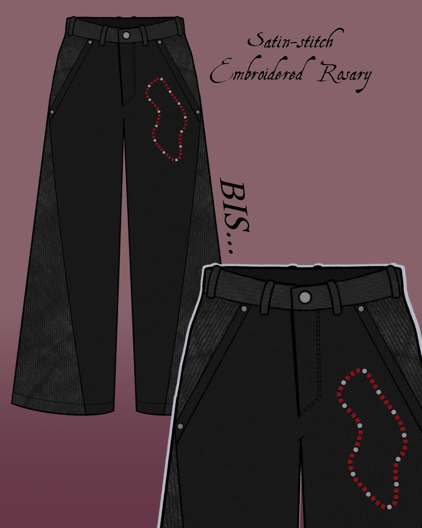 A flared trouser inspired by a building facade I saw in central london that looked coffin-esque and my personal themes of the human condition, I was reminded of the phrases "Memento amoris"(Remember to love) and "Memento mori"(Remember you must die), and created two colourways respectively. One playing with love of life and those past using textures; woodgrain and twill for contrast as well as floral detailing. The other a more macabre take on the sadness and pain of inevitable death. This is an attempt at illustrative fashion, giving the illusion of a coffin when worn.