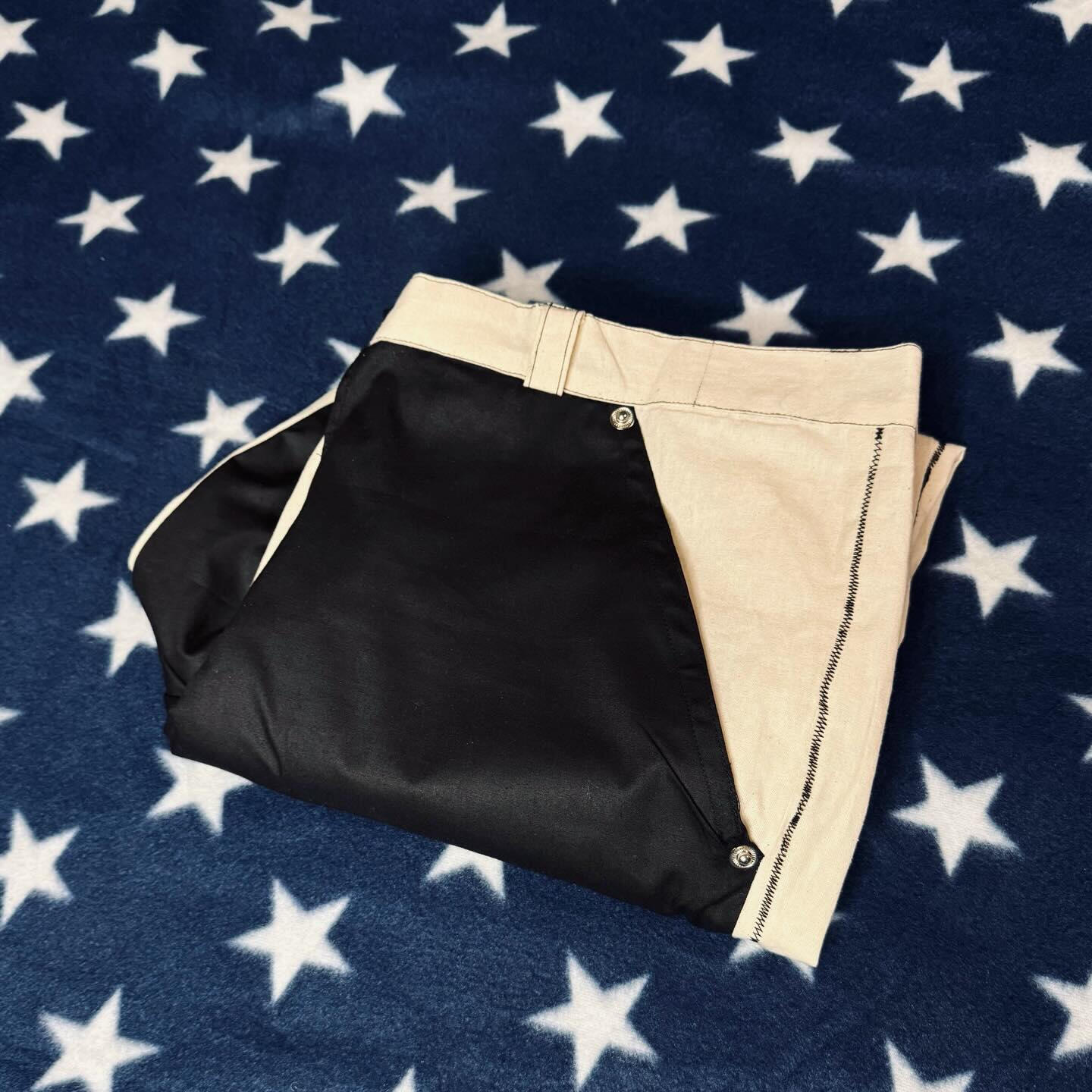 Inspired by classic Tennis skirts and Paris Hiltons quote that was repopularised by tiktok "A skirt should be the size of a belt..." An Original Belt and Tie, His and Hers set.I drafted a custom pattern to get the angled end of the belt that I wanted, wrestled with different way to create the knife pleats and had to settle on a singular pleat design which when sewed in a staggered fashion created the illusion of tennis skirt pleats.I sourced the buckle and grommets and tested a few styles and colours.The hardest part of this piece was figuring out the placement and order for the pleats on so they would hang well and still have space for a wide range of belt loops. I decided to have them go shortestest in the front to longest in the back, this greatly helped how is sat on the body when worn.